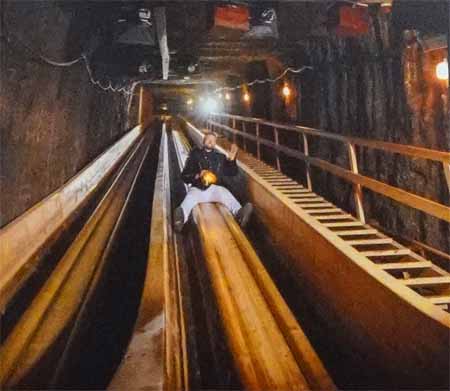 岩塩坑には長さ64mの木製滑り台で降りていく |