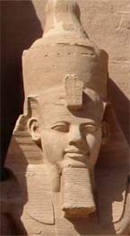 正面から見るとさすがにでかい。2番目の像は頭部が崩れて地面に落ちている。破壊したわけではなく地震で崩れたそうだ。巨大な4体の像はすべてラムセス2世のものだが顔の形がすこしずつ違う。年齢に合わせて変えているのだそうだ。