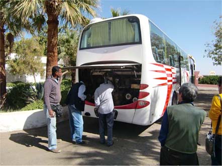 ノンストップでアブシンベルまで突っ走る。制限速度は90Kmだが120Kmくらいは出しているようだ。舗装が悪いのかよく揺れる。時々、なぜか反対車線を走る(舗装が悪いためか?)ので対向車が猛スピードでやってくるのでひやっとする。バスは『YUDON』という中国製のものだった。