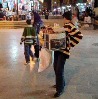 昼間よりにぎやかだった。店員が『バザールでゴザール』、『ぼちぼちでんな』など日本語のギャグで引き込みをする。