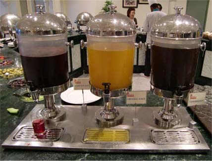 左からカルカデ(karkade)、オレンジ、タメレンディ(TAMERHENDY:Blended Nubian Spice Drink)のジュース |