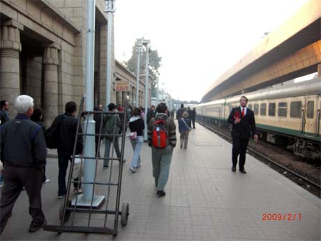 列車は定刻に着くこくとはまずないそうでこの列車も1時間遅れでギザ駅に到着した。ひどいときは2〜3時間遅れるそうだ。この日はまともに着いたほうらしい。
