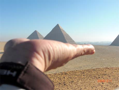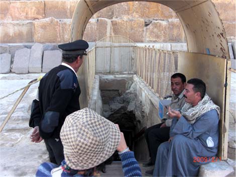 クフ王のピラミッド入場は出来ないので隣のカフラー王のピラミッドに入った。腰をかがめないと歩けない通路を行くと玄室に到達する。石棺が1個あるだけでなにもない。蒸し暑くてあまり気分がよくない。