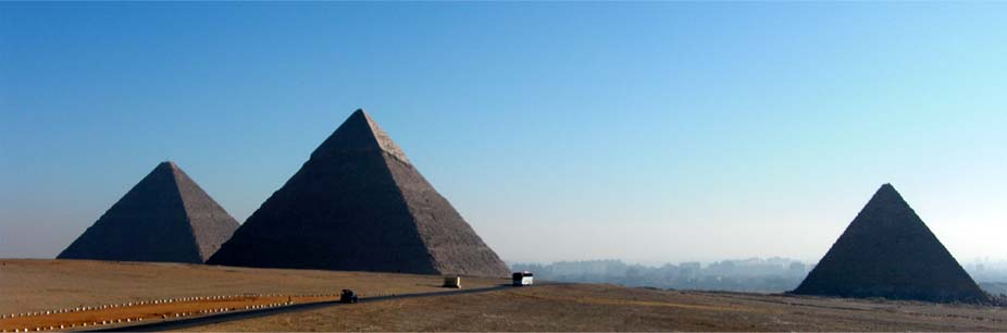 左からクフ王、カフラ王、メンカフラ王のピラミッド、この位置からはカフラ王のピラミッドが一番大きく見える。