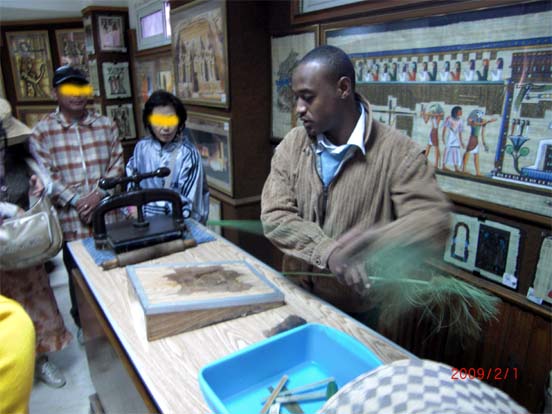 本物のパピルスは折り曲げても折れて割れないが、ニセのパピルス(バナナの葉っぱで作る)は割れてしまうと説明があった。しかしニセのパピルスも折ってもなかなか割れなかった。要するに街頭で売っている安ものはすべてニセと言うことだ。