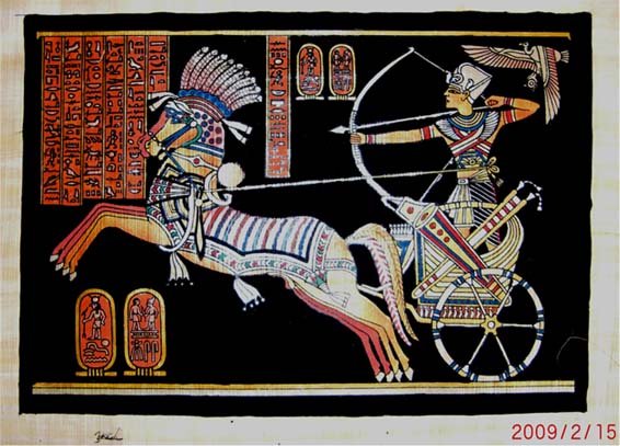 この店で買ったパピルスの絵で、アブシンベル宮殿のレリーフが原板で、ラムセス2世がシリア軍と戦う場面を描いている。馬の足が何本もあるのは躍動感を表現している。 |