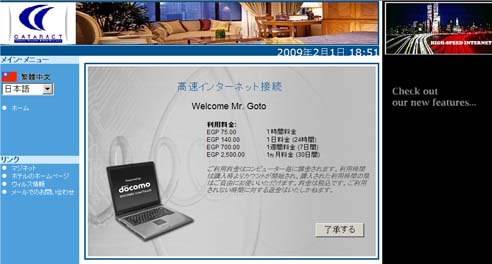 ホテルの部屋には有線LANのコネクターが備えられていた。しかし、インターネット接続は有料で24時間140エジプトポンドとある。円換算で2800円。日本の利用料よりかなり高い。ぼったくり・・・。日本ではサービスで無料のホテルがほとんどなのに・・・。 |
