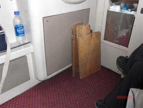 食事はいいとしてトレーを置く台が木というのはどうにかならないものか。トレー台の板を壁の穴に差し込んで使う。 |