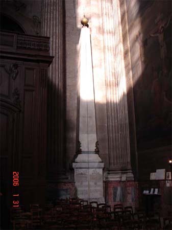 この教会の北側の壁にあり日時計の役目をしている。ラインがオベリスクの先端まで伸びている。