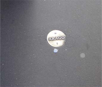 沿って,ARAGOの名と方位を示すNとSの文字を刻んだ直径12センチの金属板を合計120枚を埋め込んだ。