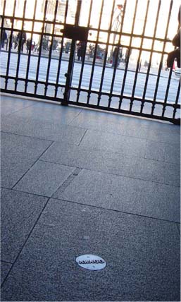 | 小説ではラングドンが、パレ・ロワイヤルで地面に埋め込まれた青銅のメダルを探す |
