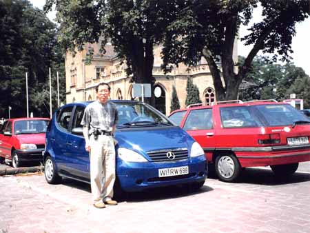 | 地下駐車場から出てアウトバーンに入るはじめての左ハンドル運転のため少し緊張する。 マニュアルでの経験は20年以上あるが安全のためにオートマチックにしておいてよかった。 随分運転が楽である。 ハイデルベルグ方向に A5に曲がろうとしたが、 右にすぐ曲がらなければならないのを行きすぎてしまった。 途中で側道に入りUターンして引き返す。 日本の高速道路ではできないことだ。 時速120kmくらいで走行する、旅行書にあるとおり みんなビュンビュンとばしていく。 このミニベンツ、高速向きのようで、150kmは軽くでてしまい、 エンジン音は比較的静か、ただ低速でのギア切り替えのショックが気になる。 チェンジレバーのDの横に+、−の意味がよく分からない。 要するに1、2への切り替えのことらしい。 |