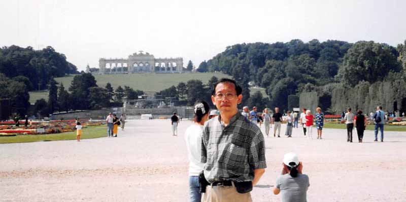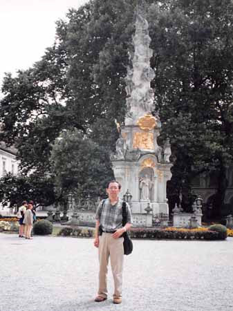 | 午前中シェーンブルグ宮殿を見に行く、シェーンブルグには地下鉄4号線のシェーンブルンで 降りて歩いて行くと下の写真の正面の門に行き着く。 内部見学は全部と一部の区分があった。 説明用のレシーバーを貸してくれるが日本語がなかった(出払っていたのか、 初めからないのかよく分からなかった)ので説明用パンフレットをくれた。 部屋番号と説明文書が書かれているが、かなり説明は簡単である。 やはり、ツアーのようにガイドが必要である。 ツアーガイドがある部屋の絵の中の子供がモーツアルトと言っていたように思うが?(少し不確か) 見学後、庭の向こうの丘の上に建つグロリエッテ(1757年のプロシア戦勝利を記念)まで歩く、 かんかん照りで汗が出る。 内部はレストランになっていた。ここからウイーンの町並みが眺望できる。