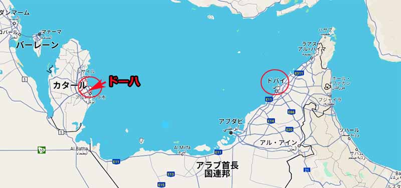 ![]() ドーハ(カタール)とドバイ(UAE)の位置関係) |