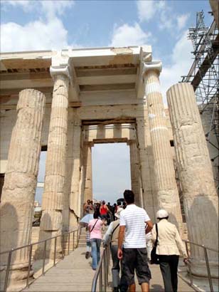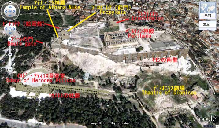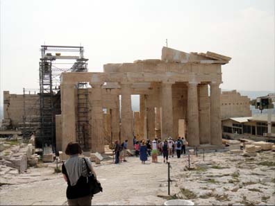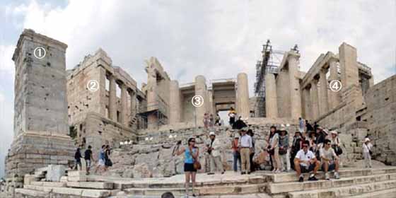 Aピナコテク(絵画館) トロイ戦争を主題とする絵などが飾られていたとのことである。休憩室として使われていたようである。 B プロピレア(前門 ) 中央正面に6本のドーリア式円柱、左右に3本のイオニア式の柱が立てられている。オスマン・トルコ支配時代に軍が弾薬庫として使用し、1645年の落雷で大爆発をおこしたり、その後ヴェネツィアとの戦闘で破壊されてしまった。その後、20世紀の初めに現在の形に復元された。 Cアテナ・ニケ神殿 ペルシア戦争での勝利を記念して建てられた。別名を翼無きニケ女神(ニケ・アプテロス)という。ニケは勝利の女神で、勝利をいつまでも残すため翼のあるニケの翼を取った像を祀った。 (※ニケはナイキと同じ)