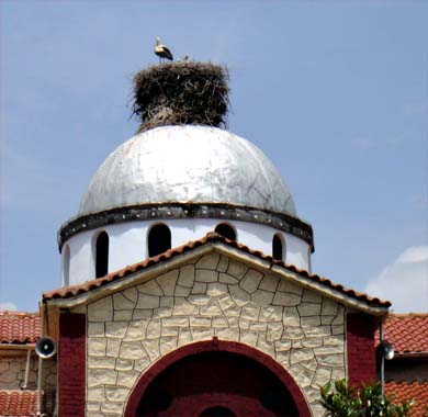 確かに教会のドーム上にコウノトリが巣を作っていた。 |
