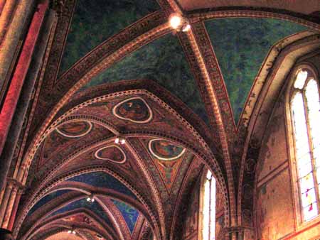 上の教会は明るい、ジョットのフレスコ画で聖フランチェスコの逸話が描かれている。