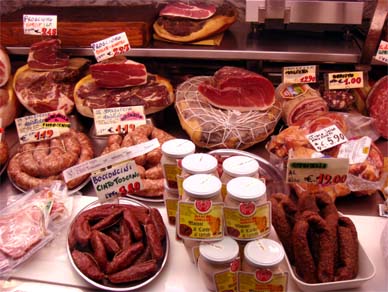 ホテルの近くの肉屋、肉以外にワイン、チーズなども売っていた |