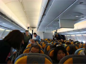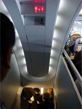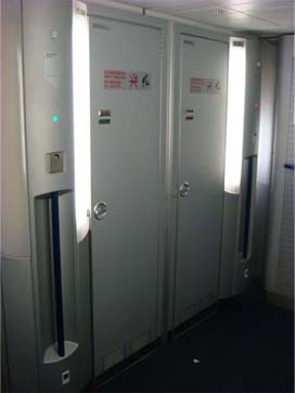 1月31日(木) 関空発のルフトハンザA340−600の機内設備は少し貧弱で座席にはオンデマンドのテレビ設備はなかった。 これは少し残念だった。 しかし、トイレが中間座席部の下に5つあり、中が意外と広くて快適。