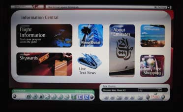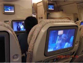 エミレーツの機内設備は最新式だった、座席の液晶画面はかなり大きく10インチくらいある。画面もかなり鮮明、エコノミー席にもパソコン用ACコンセント、LAN、USBコネクタが付いている。エコノミーの席配列は3−4−3配列だった。