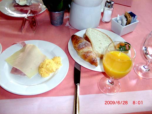 朝食にサラダがないのがさびしい、私はクロワッサンが好きなのだが砂糖が多く、まるでお菓子のようだった。どうもクロワッサンはお菓子扱いのようだ。 |