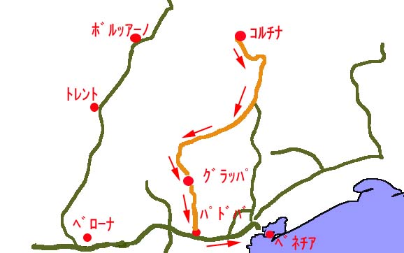 バッソ・ディ・グラッパまでカーナビで誘導させることにしたが、とんでもないルートを設定されていた。山越えを3回くらい繰り返してやっと到着した。どうもこのカーナビ大きな都市を指定するときは問題ないが小さな町を指定すると距離数だけで時間を計算するらしい。そのためアップダウン、道の通りやすさなどまったく考慮に入れていないようだ。非常にお粗末なソフトのようだ。