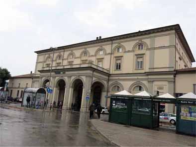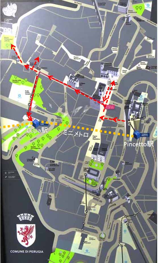 | ペルージャに着いたが、雨が降っていた。土砂降りというわけではないが、傘が必要であった。 新交通システムのミニメトロで旧市街に行くことにした。 ホームにミニメトロの案内板がかかっていたが、行くときに気がつかず駅を出てしまい、遠回りしてしまった。 |