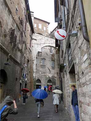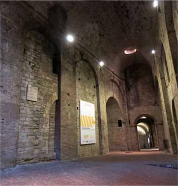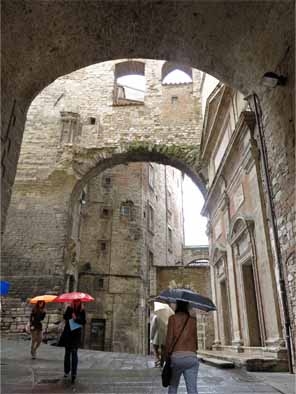 | ロッカ・パオリーナRocca paolina 1540年、教皇パウルス3世が建設させ城塞の地下にあたり、 40年ほど前に発見されたとのことだ。 県庁Palazzo del Governoの地下にあるので行ってみた。 NHKのイタリア語講座の時の映像では本屋さんがあったが、 現在はなにもなし、がらんとしていた。 人気が少なくて少し気味が悪い。 そのためか案内の女性が居た。 |