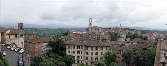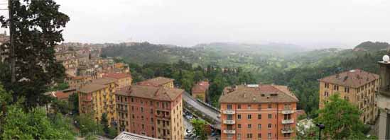 | 県庁舎の方に向けて歩いて行った。 県庁舎のある辺りがペルージャの町の端になり、 そこから道路かエスカレータでペルージャ駅につながっている。 県庁舎の裏側が公園と展望台になっておりペルージャ駅方向が見渡せる。 |