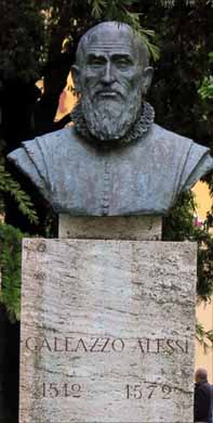| 聖ルカのアーチをくぐってさらに行くと、サン・ベルナルディーノ教会 San Bernardiが見えてくる。 教会のファザードはA.ディ・ドウッチョAgostino di Duccioによるルネサンス様式で作られている。 アゴスティーノ・ディ・ドゥッチョAgostino di Duccio 1418‐81 イタリアの彫刻家。フィレンツェ生れ。 1433年以降生地を離れる。 1442年,モデナ大聖堂の祭壇浮彫を制作。 その後フィレンツェに戻るが窃盗の嫌疑を受けて北イタリアに出奔。 リミニでテンピオ・マラテスティアーノの装飾に従事(1449ころ‐57ころ)。 これは,傭兵隊長で学者であったリミニの君主マラテスタSigismondo Malatesta(1417‐68)が 自分と愛人イゾッタIsotta degli Attiを記念するためにアルベルティに設計させた建物で, アゴスティーノは大理石の内壁に,キリスト教信仰に対する マラテスタの懐疑と異教趣味を物語る多様な主題を, きわめて薄肉の浅浮彫で表した。 引用:コトバンクより |
