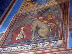 | アーチに支えられた、奥行き27m幅14mの広間で、 天井は旧約・新約聖書を主題にしたフレスコ画で飾られている。(14世頃の作) 壁には1499年までの歴代執政長官の紋章が描かれている。 |