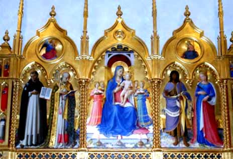 | マリアがキリストを抱いて白百合(マリアの純粋と純血を表す)を持ち、 右手に聖書を持って読んでいる。 マリアの横に聖ヨハネと聖ローレンスが立っている。 左下のひげをたくわえ、杖をついている老人が聖オノフリオ、 右下はペルージャの司教バヌッチ・ヤコボ。 聖オノフリオ 3〜4世紀、ローマでキリスト教が支配的になった時代の人で、法学と哲学を学び、 その後エジプトのテーベで僧侶になった。 仙人になるため砂漠を放浪していたとき、17日目に葉のふんどしをつけ、 髪に覆われた異形の者に遭遇し、びっくりして山に逃げ込んだ。 この異形の者は『神の人よ、私と一緒に山を下りよう。 私も神の愛のために砂漠に住んでいる人間だ』と彼に呼びかけた。 異形の者は彼自身の姿だった。 聖ローレンス 258年にローマ皇帝ウァレリアヌスの迫害で殉教した人で、風の守護聖人となっている。、 |