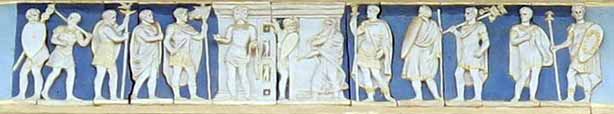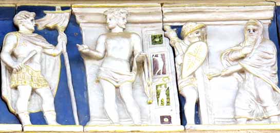 | このフリーズのテラコッタはギリシャ・ローマ神話を題材としている。 このテラコッタにはいろんな解釈があるが、ネオプラトニズムのギリシャ・ローマ神話、人間の魂を善悪に選択する様子を表している。 |