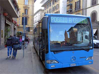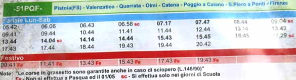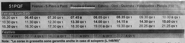 ![]() ポッジョ・カイアーノ行きのバス時刻表、直通以外にQarrata、Pistoia行きも停車する。 ![]() 京都飯店の前がバス停留所、ブルーバス ポッジョ・ア・カイアーノ行きの表示。 |