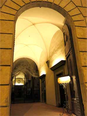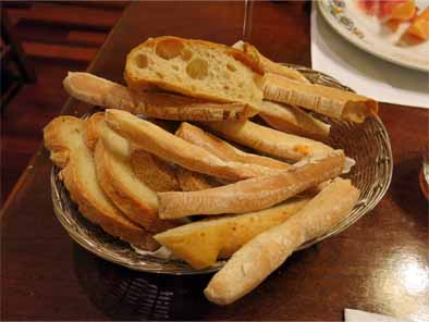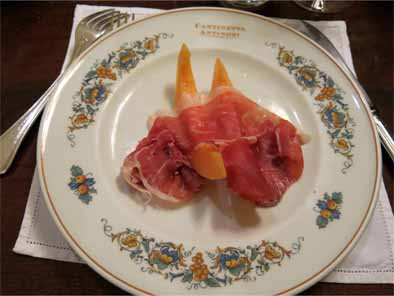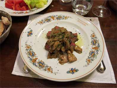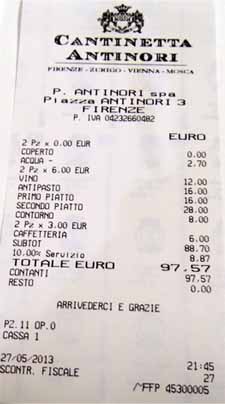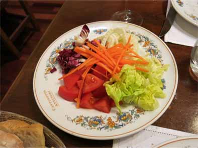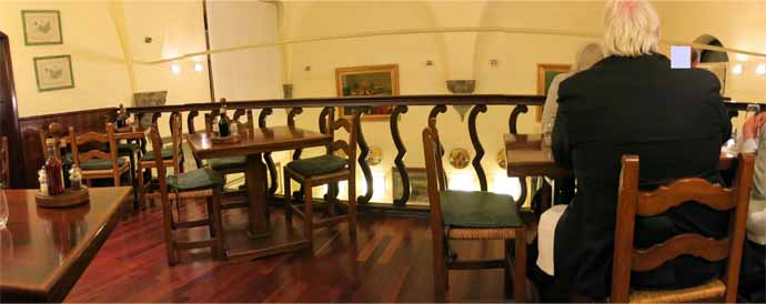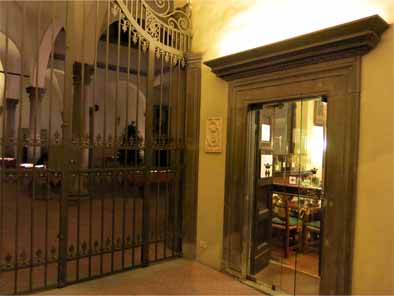| ホテルにもどって少し休憩し、少し薄暗くなった午後8時頃夕食に出かけた。 今日は最終日なので再度奮発して、最初の日に行けなかったカンティネッタ・アンティノーリCantinetta Antinoriに出かけた。 このレストランはもともとはエノテカ(ワイン製造業者の直営店)なのでワインを飲むのがメイン。 ワインはグラス(ビキエーレ)で銘柄の違うワインをいくつでも注文できる。 いくつもの銘柄を飲みたいう人にはありがたいし、アルコールに弱い人には助かるやりかたである。 ワインはおまかせ(コンシーリアで通じた)で赤ワインをグラスでたのんだ。 赤ワインはあまり飲まないほうだが(いつも薬を飲んでいる味がするから・・)、しかし、ここのワインは違った。 少し酸味があって、気に入った。 日本にもどったら、通販であるなら買ってみよう。 |