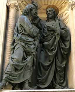 | 『聖トマスの不信』 キリスト十二使徒の中でただ1人、イエスの復活を信じない聖トマスは、「主の傷痕に指を差し入れるまで復活を信じない」と言った。 8日後に聖トマスの前にイエスが現れ、自分の傷痕に聖トマスの指を差し入れさせた。 そのことで聖トマスはキリストの復活を信じたというお話し。 |