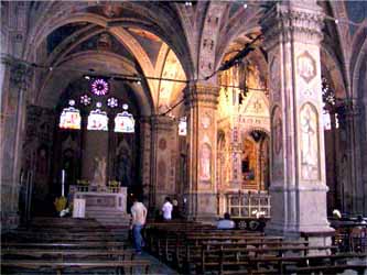 | 何回かフィレンツェにきて素通りしてきたオルサン・ミケーレOrsanmichele教会に行ってみた。 1240年に小麦市場と礼拝所の2つが入った建物が作られ、その後、火災に遭って消失。 1333年から再建が開始された。 内部は2階建てになっている、少し変わった形の教会である。 もとは1階に吹き抜けのアーケードのある市場で、2階が礼拝所になっていた。 オルサン・ミケーレはオルティ・イン・サン・ミケーレ(聖ミケーレの菜園)がなまってこう呼ばれるようになった。 イタリア語のミケーレ ( Michele) は、天使ミカエルのことで、鎧を着て天使の軍団の先頭に立つ、いさましいイメージの天使。 ちなみに天使を意味するイタリア語アンジェロ (Angelo) と組み合わせるとミケランジェロ (Michelangelo)になる。 英語での人名ではマイケル(Michael)、フランス語ではミシェル(Michel)など、この天使名に由来するもの。 |