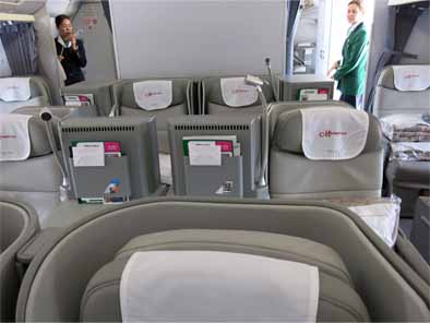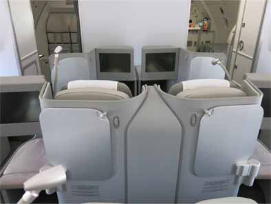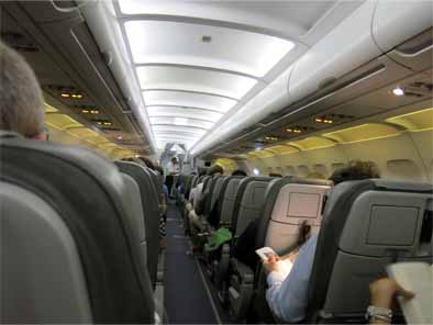 | アリタリア航空A319のビジネスクラスは少し変わっていて1−2−2になっている。 1人で乗る場合でも窓側は隣の席の人をまたいで通路に出る必要はない。 しかし、そのためシートが狭くなっている。 体格の大きな人は少し窮屈だろう。 |