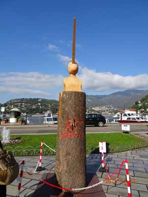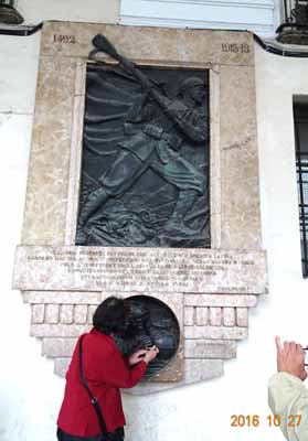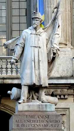 サヴォイア家は現在のフランスからイタリアの国境をはさまれた位置にあり、フランスとスペインハプスブルグ家の争いから同家の領地はフランスに占領されていた。 エマニエーレ・フィルベルト・ディ・サヴォイアは1557年にサンクィンティーノの戦いBattle of St. Quentinでフランスに大勝し、サボイア家の領地を奪還した。勝利後に剣をさやに収める動きを表している。『青銅の馬』"Caval 'd brons"と呼ばれている。