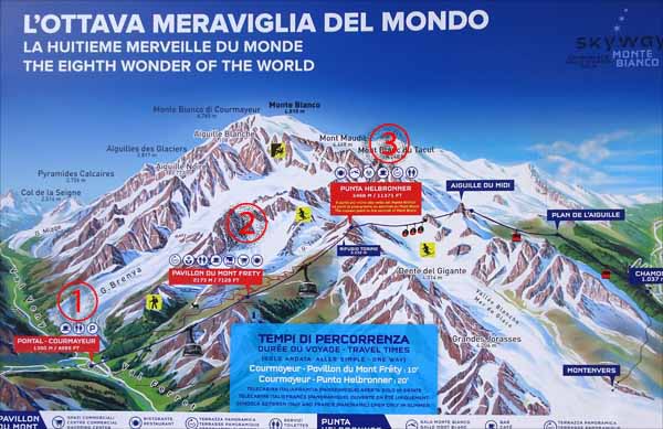 モンブラン(モンテ・ビアンコ)のイタリア側のふもとクールマユールからエルブロンネル展望台(標高3466m)へロープウェィの2015年5月31日に開業した。