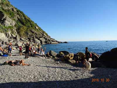 町の広場とは逆にトンネルをくぐって左に下って行くと、リグリア海の湾に出る。この小さな入り江は絶好の写真スポット。 |