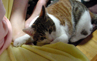2001年11月21日 もらってきたのが10月はじめ、約1ヶ月がたちました。 最初はかなり警戒していて、すぐに机の裏側に逃げ込んだり、ものいれの隅に入り込んだりしていました。 最近では妻に一番なついてしまって、膝の間に入り込んで前足をおしゃぶりしている。人間の赤ん坊のようなので笑ってしまう。