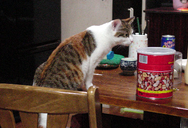 テーブルの上のおかずの残りを狙っている現場をキャッチしました。動かぬ証拠です。