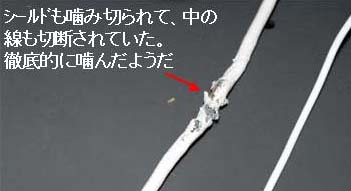 なんとコードが裂けている・・・。やられた、最近コンピュータラックの後ろに入り込んでゴソゴソしていると思ったら、モニタコードをかじっていたのだ。
