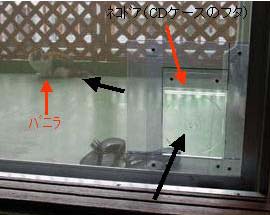 2002年4月26日(金) ネコドア第二弾完成 ベランダに出ることが好きになり、長い時は4〜5時間ベランダでじっとしてあちこち見上げている。時たま虫をめがけて飛びついたりしている。 出入りのために網戸を常時開けておくと虫が入って来るので困る。 そこで網戸の網にネコドアを作ることにした。 出来るだけ簡単に早く、安上がりにすることを目標にプランを立てた。 扉の部分にCDケースを使うことにした。 塩ビの板を買ってきてCDケースの大きさに切り込んで四角の穴をあける。 あまった板を網を挟み込むようにしてネジで固定する。 大成功、CDケースのふたのちょうつがいが丁度うまい具合に動く。 バニラを捕まえてネコドアに押し込むするっと抜けてベランダへ出ていく、2〜3回教えたらすぐにおぼえてしまった。 今は、戸を開けてやると出入り自由で行ったり来たりしている。 ただし、外へ出るので汚れが目立ってきた。 | ![]() |