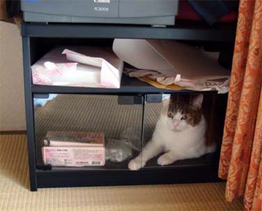 テレビ台の下のガラス扉の奥に入っている。テレビは置かずに現在コピー機の置き台にしているのだが、最近、下の扉の中身を片付けたので空きが出来ていた。