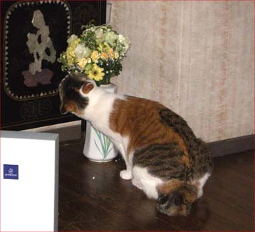 以前に猫がかすみ草が好きだということを書いたことがある。本日、生け花をもらってきたので花瓶に入れて置いていたらバニラがやって来て花びらを食べ始めた。
