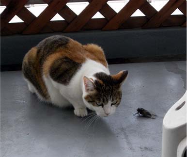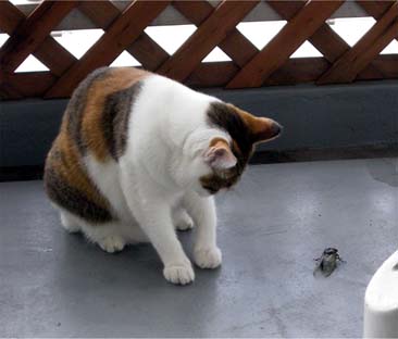 7時半過ぎに起きてベランダを見るとセミをゲットして遊んでいた。