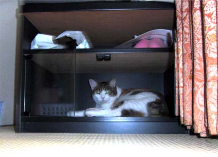 昨夜は29度くらいまで温度は下がっているのだが湿度が高く寝にくい。 エアコンをつけようかと思ったが起きるのがじゃまくさくなってそのまま寝てしまった。 バニラも寝にくいのか、カーテン後ろで尻だけ出して寝ていたが、朝方はテレビ台の下に入ってひっくり返って寝ていた ネコも人間に飼われていると飼い主と同じように夜間はいっしょに寝てしまうのが多いそうだ。