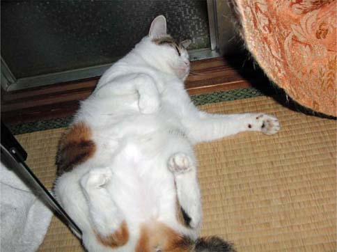 朝カーテンを開けたらひっくり返って爆睡していました。 |